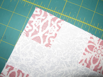 Sew 2" squares of red fabric to corners of 6"" white square.